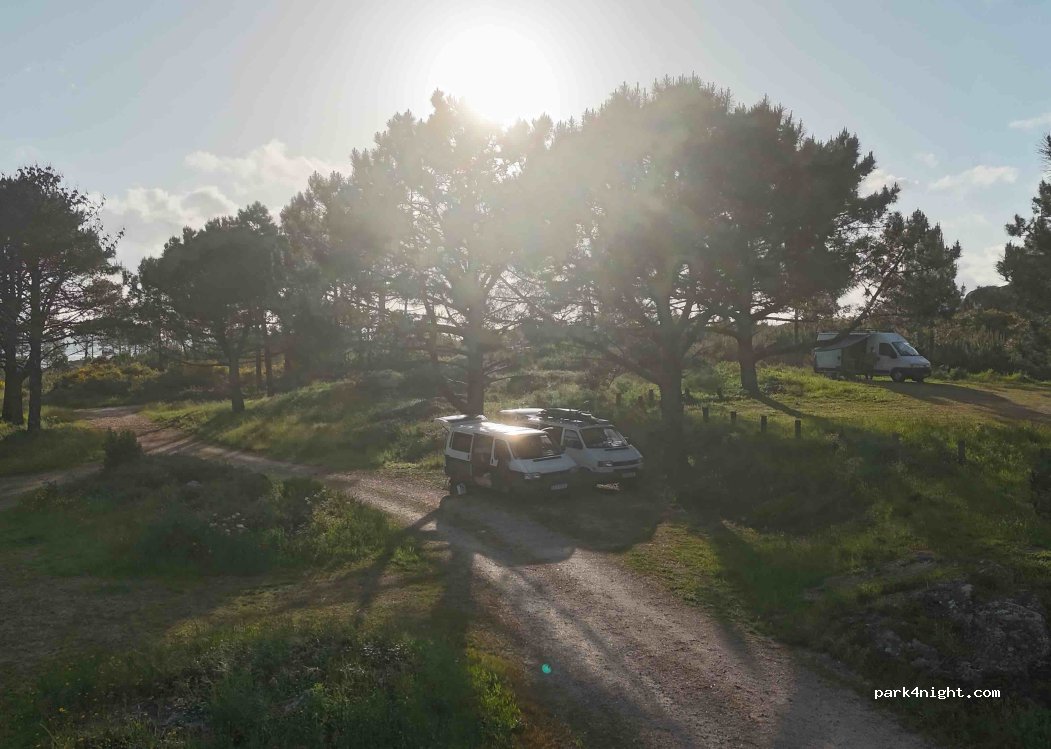Zona de pinares con sombras, 500 mts antes zona de vaciado, no vayais hasta el parking de la playa, hay vigilante y solo es para turismos.Nos quedamos dos noches, la playa increible.