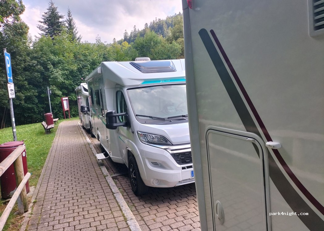 Llegamos justo a tiempo, ya a que solo hay plaza para tres caravanas y va ya habían dos aparcadas. Pasamos una tarde vi citando Triberg, y dormimos ahí. Tuvimos que calzar la caravana porque hay un poco de desnivel, pero dormimos bien. No tiene servicios, aunque en la ciudad a unos 5 min caminando hay unos wc públicos.