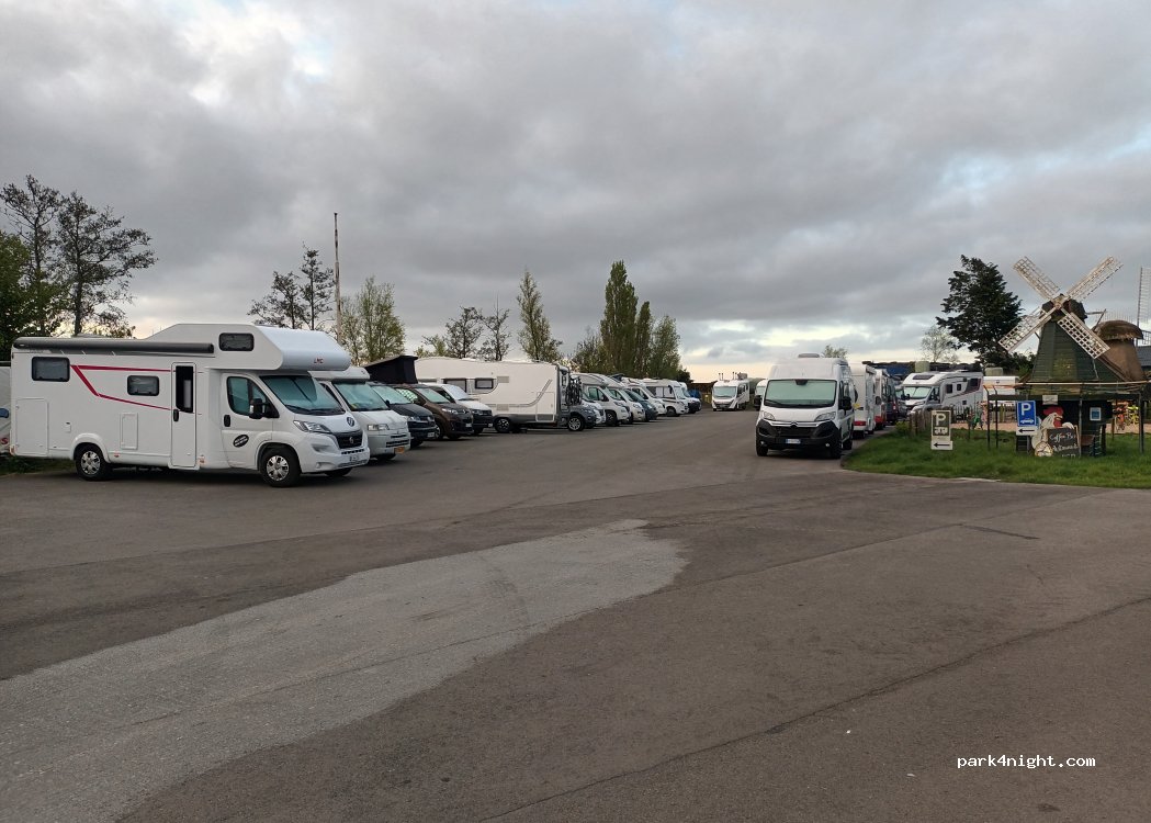 Excelente area de autocaravavanas (parking) donde puedes dormir de 17.00 a 9.30... luego pedimos permiso para permanecer aparcados y poder visitar su exposición de Molinos, fábrica de quesos, tienda d souvenirs. puedes cargar agua, pero no vaciar ni limpiar wc. Noche perfecta, tranquila. Dueños amables. Fantástico lugar. Gracias.