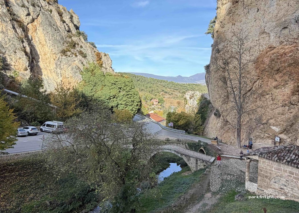Parking a pie de carretera perfecto para visitar el pueblo (cascadas, ermita…) pero también para hacer la via ferrata que comienza un poco más a la derecha de la ermita. Las furgos y ACs entran aunque en principio es para turismos. Mi furgo hace 6m y entraba bien.