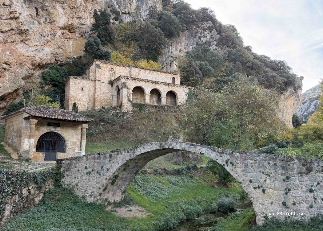 Aparcamiento a la entrada de Tobera,frente a la ermita,humilladero, puente medieval e inicio ruta cascadas. Apto para autocaravanas grandes. Mucha rotación de vehículos,con lo que resulta fácil aparcar.