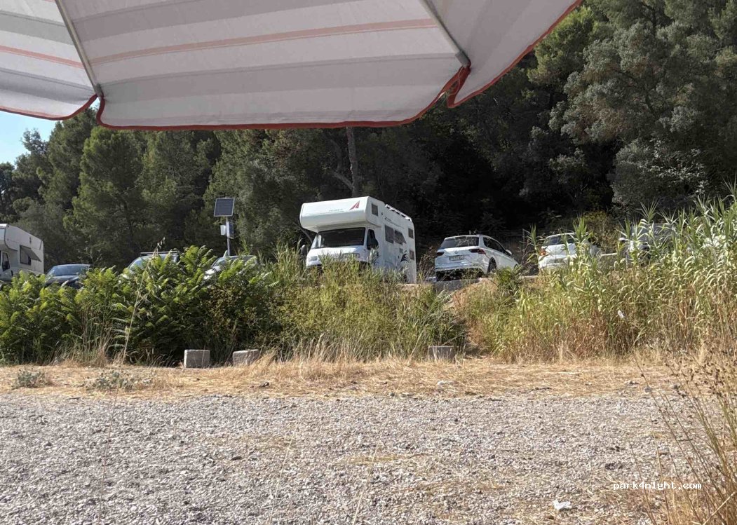 Aparcamiento para 5 autocaravanas, pasamos la noche junto con 5 autocaravanas mas al estar el camping lleno. Algo de ruido por la carretera pero buenas vistas.