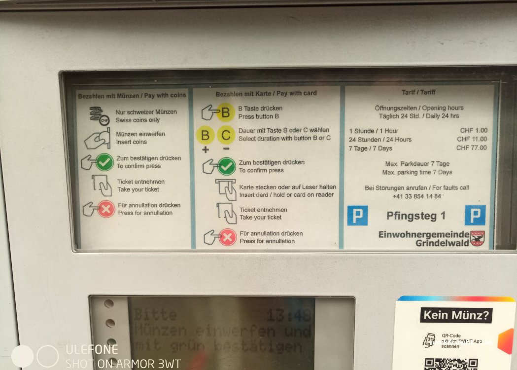Baños limpios, 1chf por hora sueltas, mejor precio para más horas de estancia. Buena ubicación para visitar el pueblo. Hay señales de no acampar.