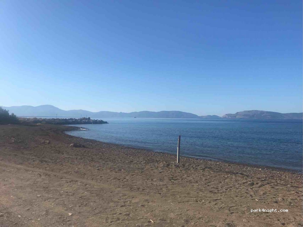 In einem Wohngebiet, am Ende einer Straße, kleiner Strand. Wunderschöne Aussicht auf Hydra. Ein paar Sonnenschirme der Einheimischen am Strand. Etwas Schatten am Morgen, wenn man hinter den Palmen parkt. Und das Tüpfelchen auf dem i: eine Stranddusche 50 Meter rechts. Kurz gesagt, ein ruhiger Ort, den man respektieren sollte.