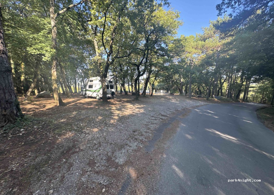Sommes arrivés de nuit, accès chemin correct, une côte un peu raide mais largement faisable en camping car. Bien suivre la direction du mémorial. Avons passé une nuit de passage un samedi soir, excellente, au calme dans le bois à qq km de l'echangeur. Aucun véhicule et endroit propre à respecter. Pas de services mais container poubelle