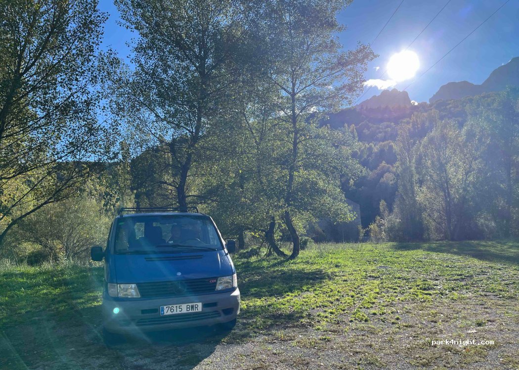 Buen sitio para pasar la noche, muy tranquilo con mucho espacio al haber dos explanadas. Mucho mosquito pero es lo normal al estar cerca del río. Nosotros dormimos justo en la primera explanada y no hemos escuchado el ruido de las turbinas que se comenta. Repetiríamos sin duda.