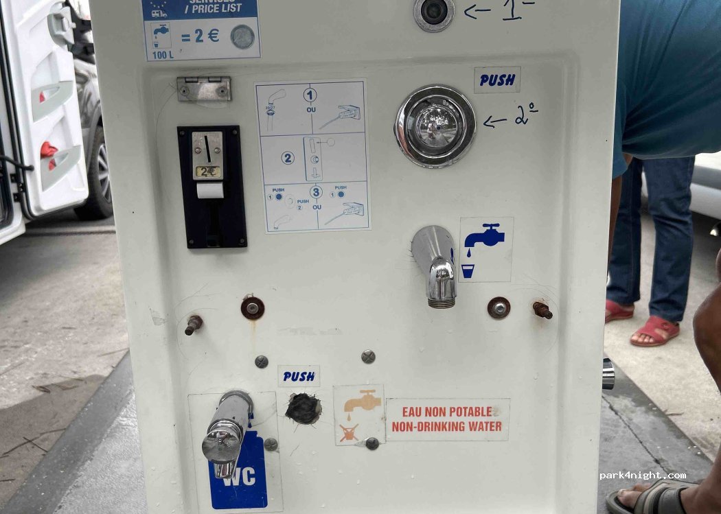 services uniquement. 100L d'eau a 2€ (attention, il faut rester appuyer sur le bouton du robinet, notre cuve de 100L n'a pas été complètement remplie, et une employée nous a gentiment remis 2€ pour qu'on puisse finir. vidange cassette.