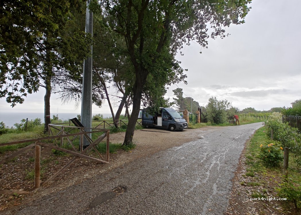 Semplicissimo posto molto tranquillo pur essendo vicino al centro città, solo per van e macchine, rispetto al punto segnato proseguendo fino a un cartello di divieto, si trova un piccolo slargo dove fermarsi con la vista sul mare. La barra con lucchetto è il punto di accesso per il parco e la discesa a mare.