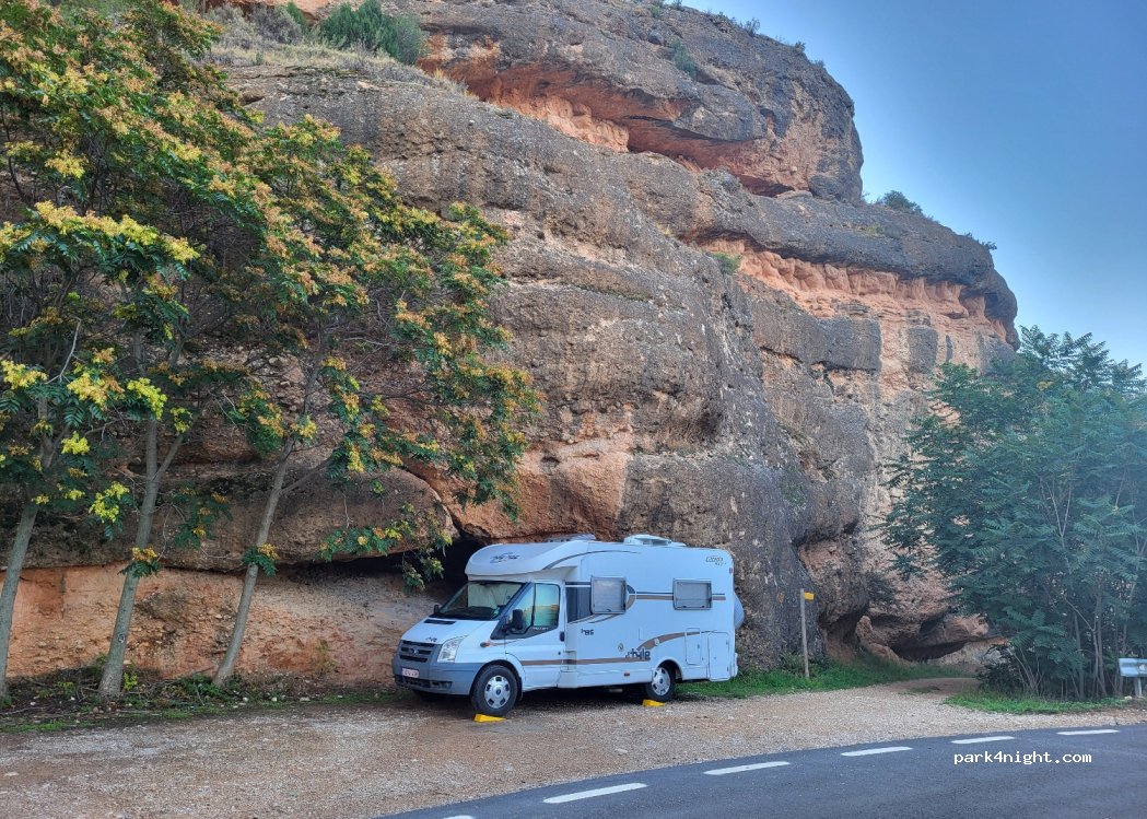 Onze jonge kinderen wilden niet verder rijden dus we stopten hier. We staan een beetje scheef en hopen dat er geen controle komt. We reden de route van teruel naar caspe en dat is waanzinnig mooi!