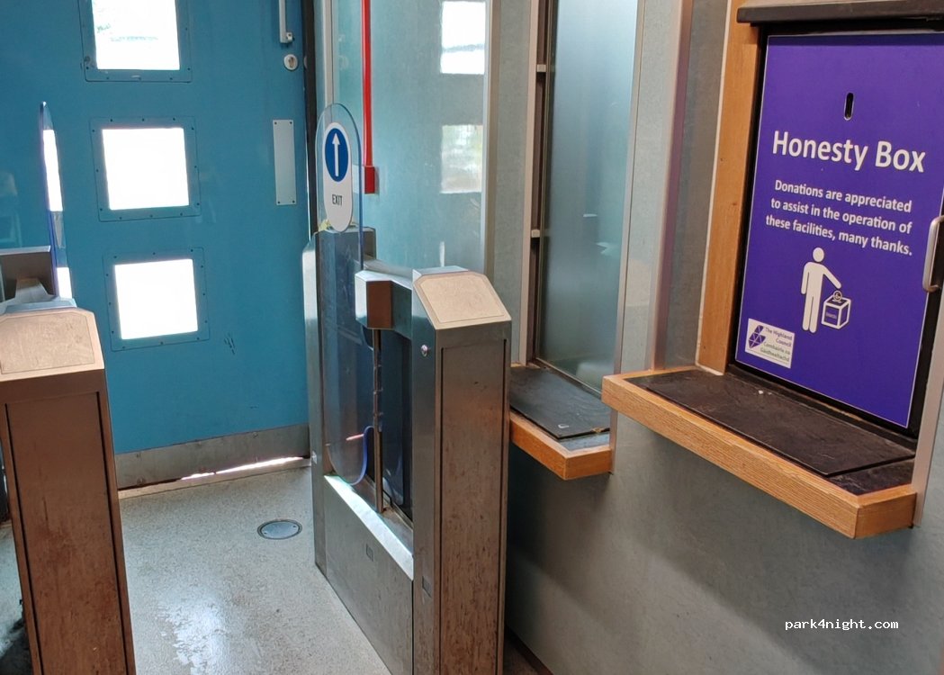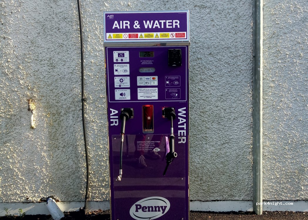 Très bien pour laver mais le sèche linge coûte très cher. 7.50 livres pour 30 min c'est hors de prix. 6,50 pour laver avec soupline et désinfectant. Remplissage d'eau possible mais payant à la machine pour faire la pression des pneus. Pour 3 livres on a eu à peine 50 litres. Il y a un caniveau à côté du remplissage nous y avons vidé nos eaux grises.