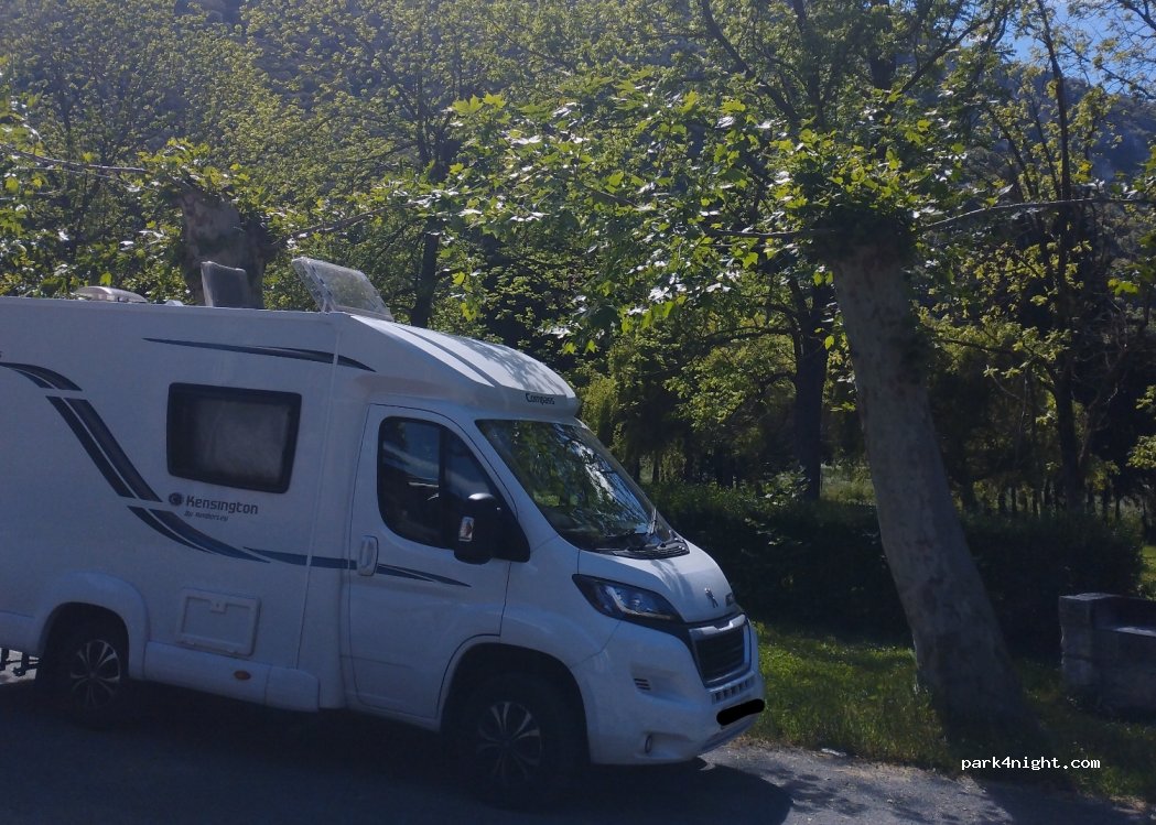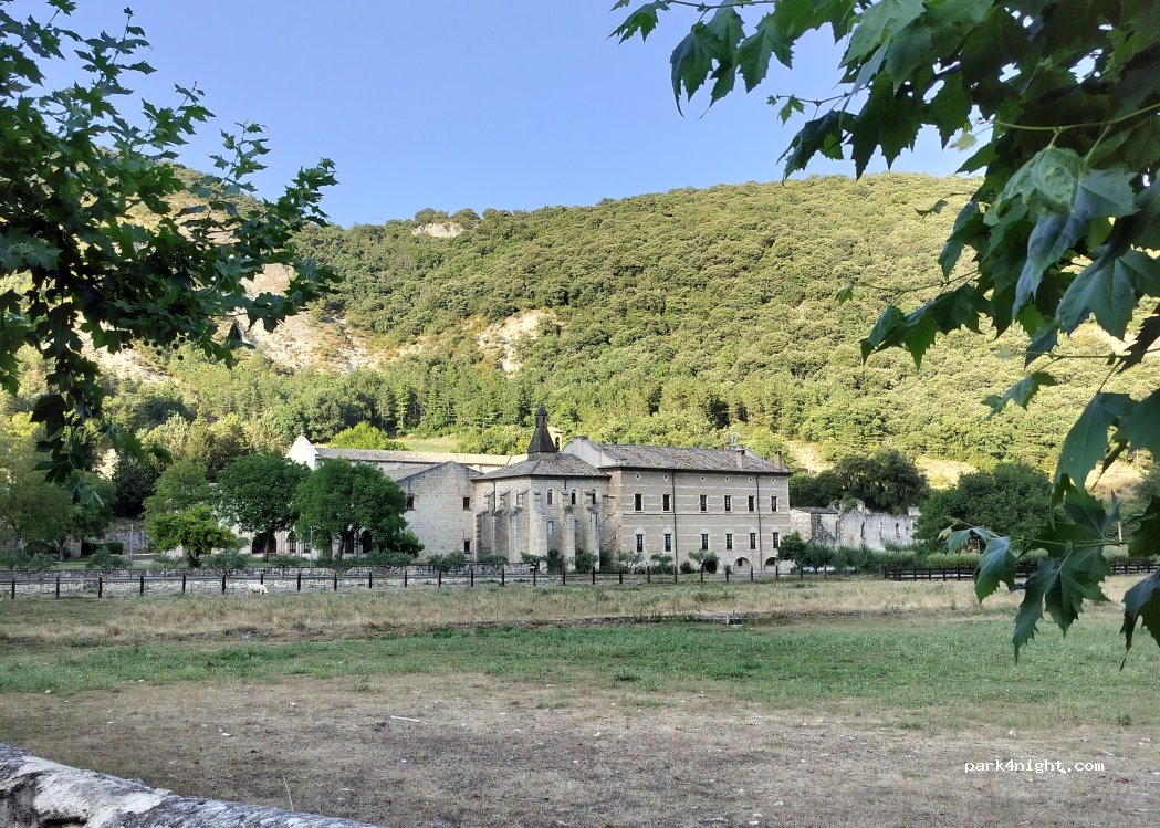 Magnifique endroit pour dormir. Calme sous les arbres et dans l’herbe. Il y a des tables de pic nic et une fontaine. Une partie du parking sur bitume le long de la route en cas de pluie. Le site est magnifique. L’abbaye cistercienne mérite le voyage et la visite (3€/personne)