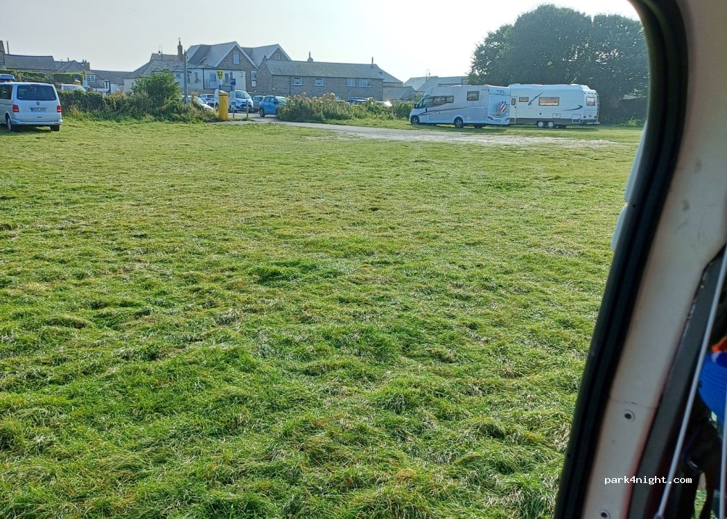 great big grassy field in the centre of the village. quiet, great view,public toilets close by. car park next door has showers for 50p. cost £8 for 24h