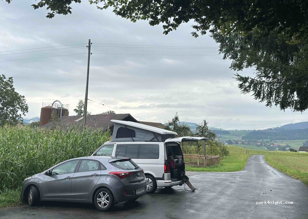 Lovely spot in the countryside. However it is located on an unmarked car park for forest hiking trails, just near a farm and its inhabitants. So be discreet and respectful. Also, the bin was overflowing, so please take your rubbish with you if this is the case when you stay. Free spots are a rarity in Switzerland, so let’s do our best to avoid worsening our reputation ✨