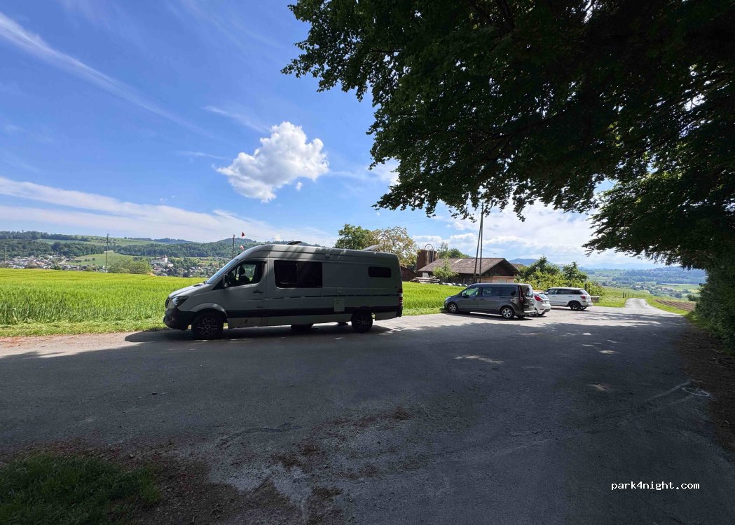 Wir haben hier eine Nacht geschlafen und konnten problemlos unseren Camper mit 7 m Länge parken (seitlich geparkt und es war noch Platz für andere). Wir waren ganz allein und die Aussicht über die Felder ist echt schön. In der Nacht haben wir die Glocken von den Kühen gehört, was uns aber nicht gestört hat.