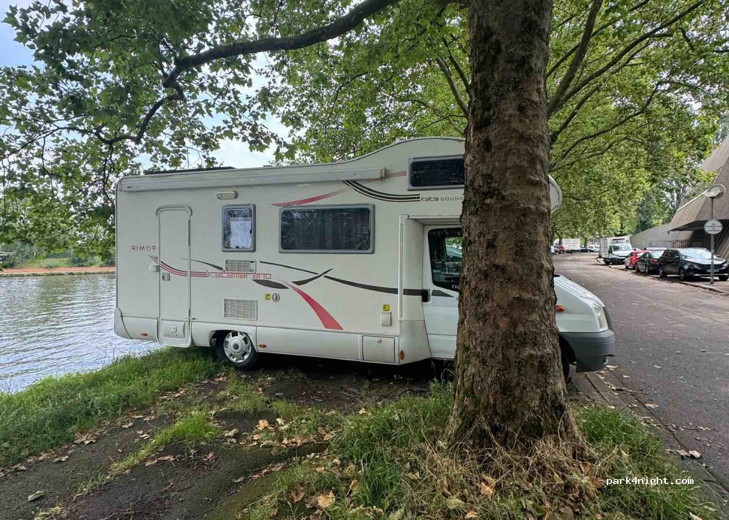 Beautiful spot next to the river. Overall quiet, yet one party boat parked for about an hour until 23:00, but then left. We stayed on a Wednesday overnight but on Thursday morning the place starts filling up with city commuters, of which one threatened to block us in. So we decided to leave and unfortunately didn’t get to visit Strasbourg due to the parking limitations.