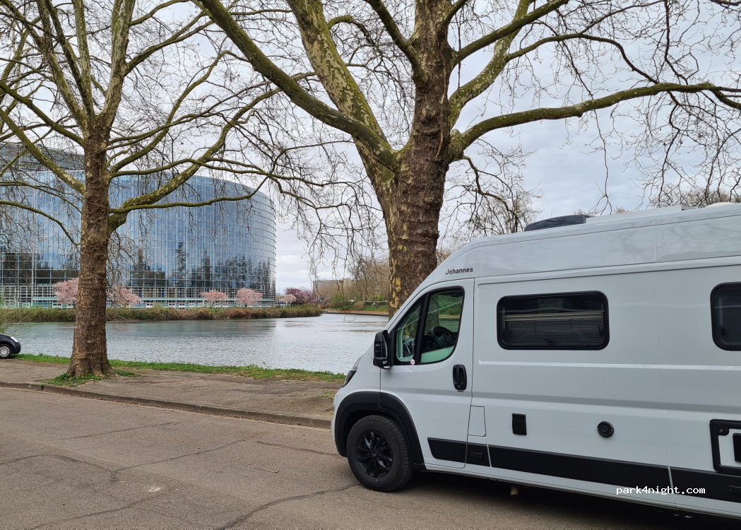 Super endroit calme dans Strasbourg avec vue sur le parlement européen ! C est incroyable de pouvoir bivouaquer en ce lieu alors que dans une petite commune la PM nous chasse. Merci à Strasbourg pour votre tolérance.