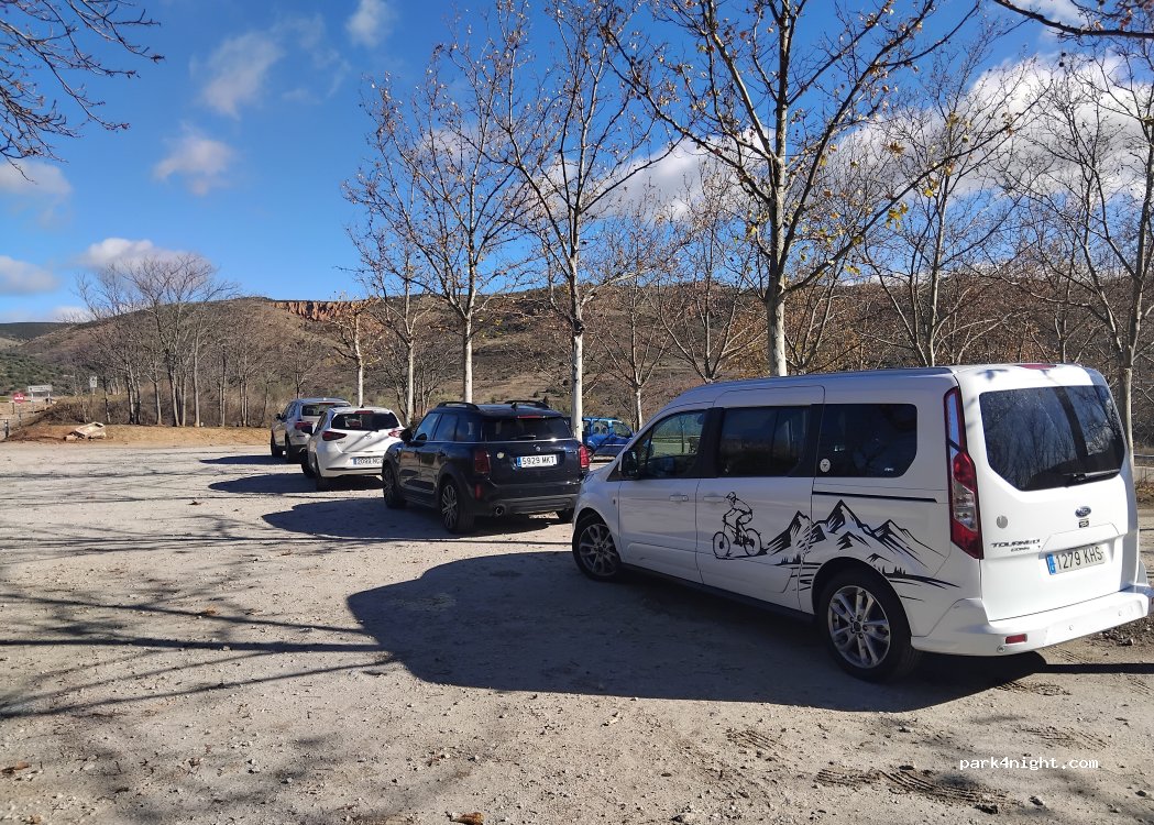 Zona tranquila y sombreada para dormir. Varias zonas de aparcamiento llanas. Las de abajo tienen dificultad de acceso. Es mejor ir a partir de las 21 ya que durante el día tiene mucho movimiento. Al ser una zona perfecta para rutas en moto, por la mañana se empiezan a oír.