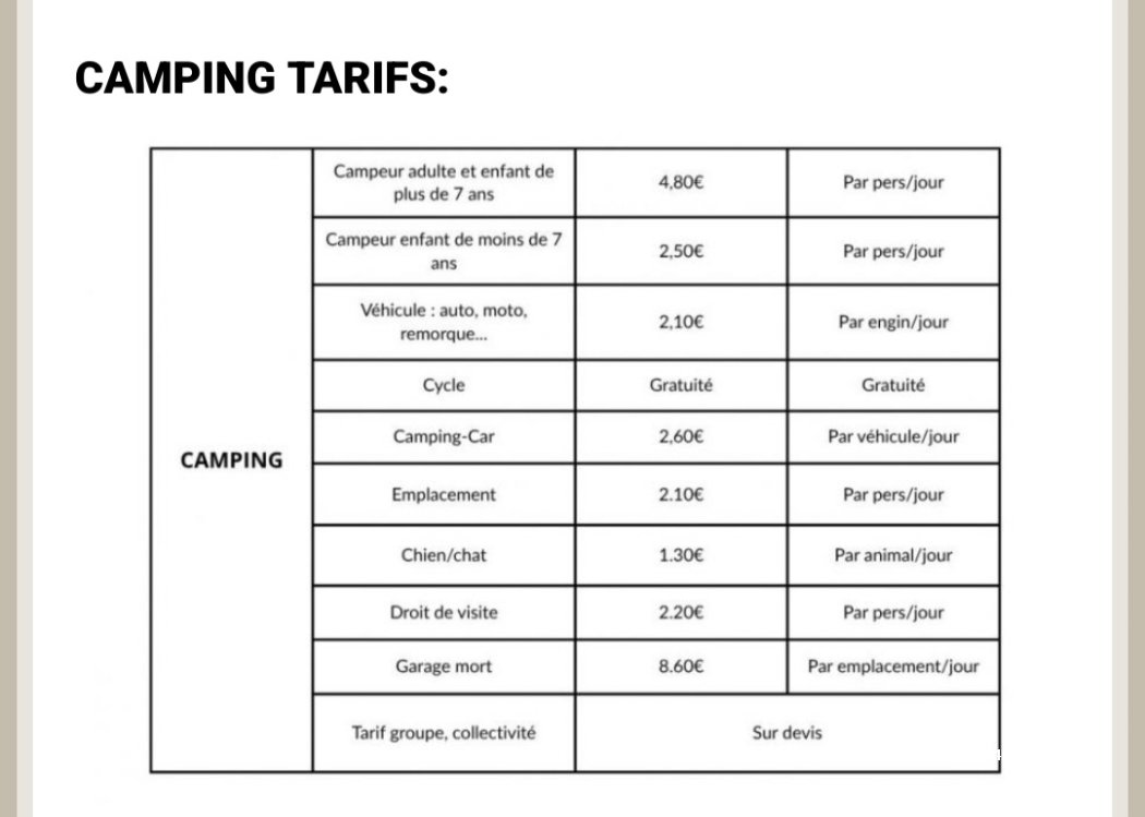 La tarjeta ACSI es aceptada en temporada baja, a un precio de 17 € por noche, sin incluir la tasa turística, durante los siguientes periodos de la temporada 2025: desde la apertura hasta el 24 de mayo, luego del 1 de junio al 4 de julio, y del 1 de septiembre hasta el cierre.