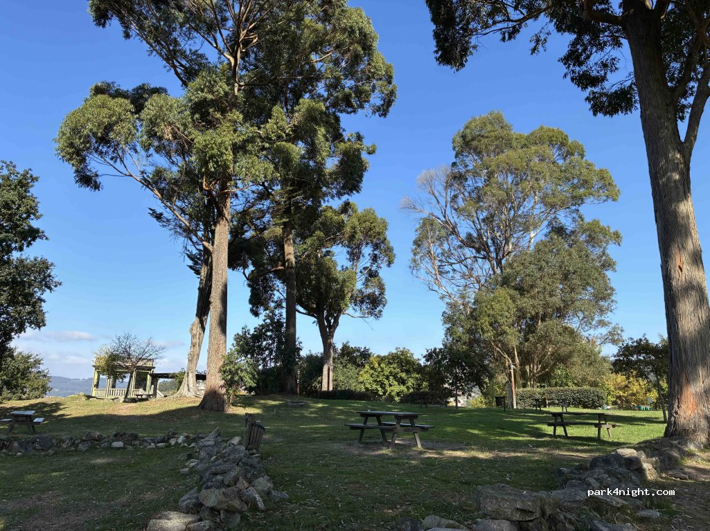Aparcamiento en medio de un parque con grandes árboles, zonas verdes, mesas de picnic, juegos infantiles, fuentes, etc. Muy tranquilo y seguro, apenas a 35 minutos caminando al centro o 10 minutos en bicicleta