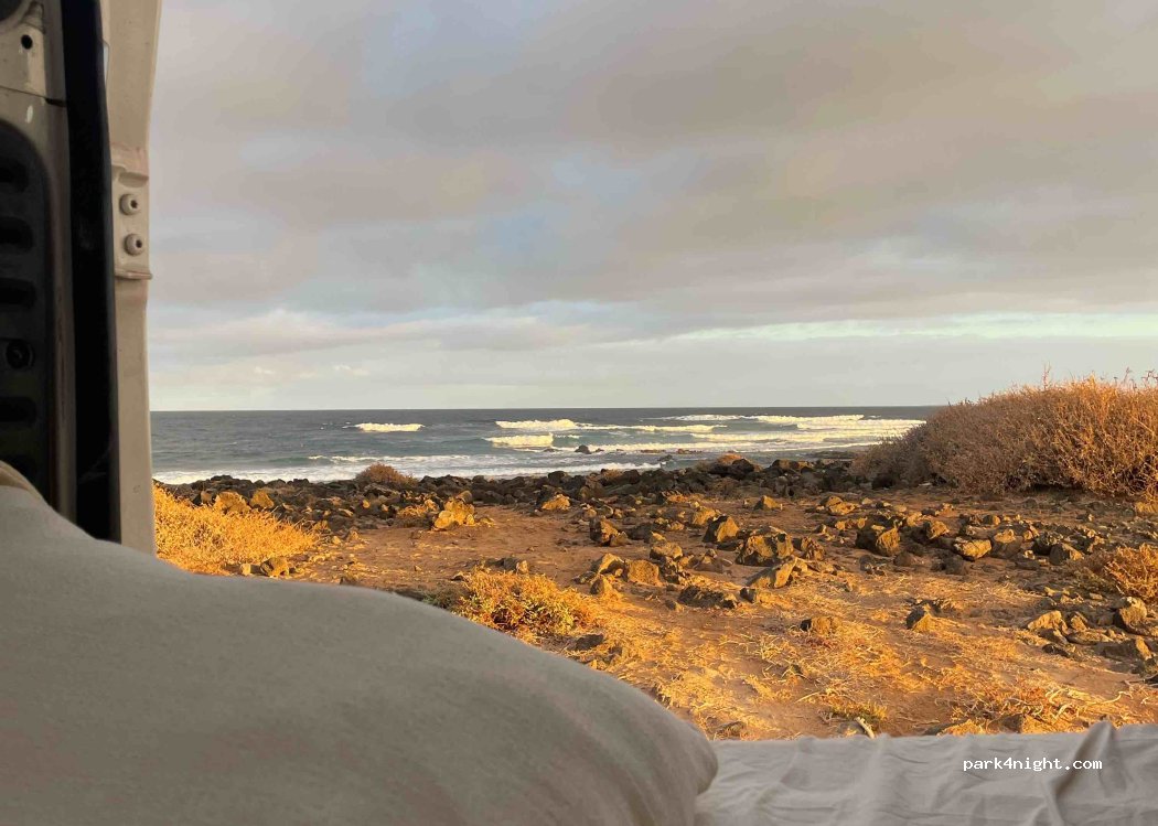 There are several parking spots in front of the rocky beach which do get quite busy during the day. There is also a prohibition sign for motorhomes, though not entirely sure which area prohibition actually covers.. The place that is indicated in P4N is blocked by big rocks and the only potential access seemed way too steep and bumpy for our >7m motorhome. Didn't stay overnight in the end.