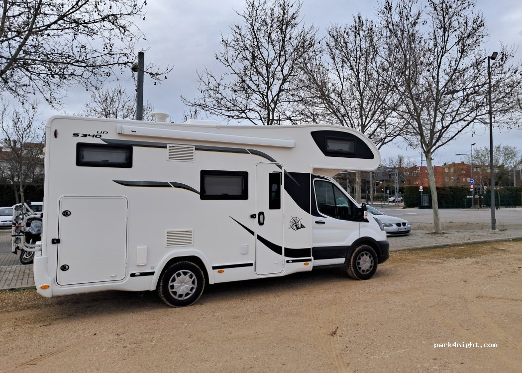 Quiet car park next to the tram line that takes you into Madrid. We parked our 8m van on the right hand side with no problems overhanging the grass. There is a large gravelled site right next door too. This is a rich area, safe. plenty shops, bars, restaurants.