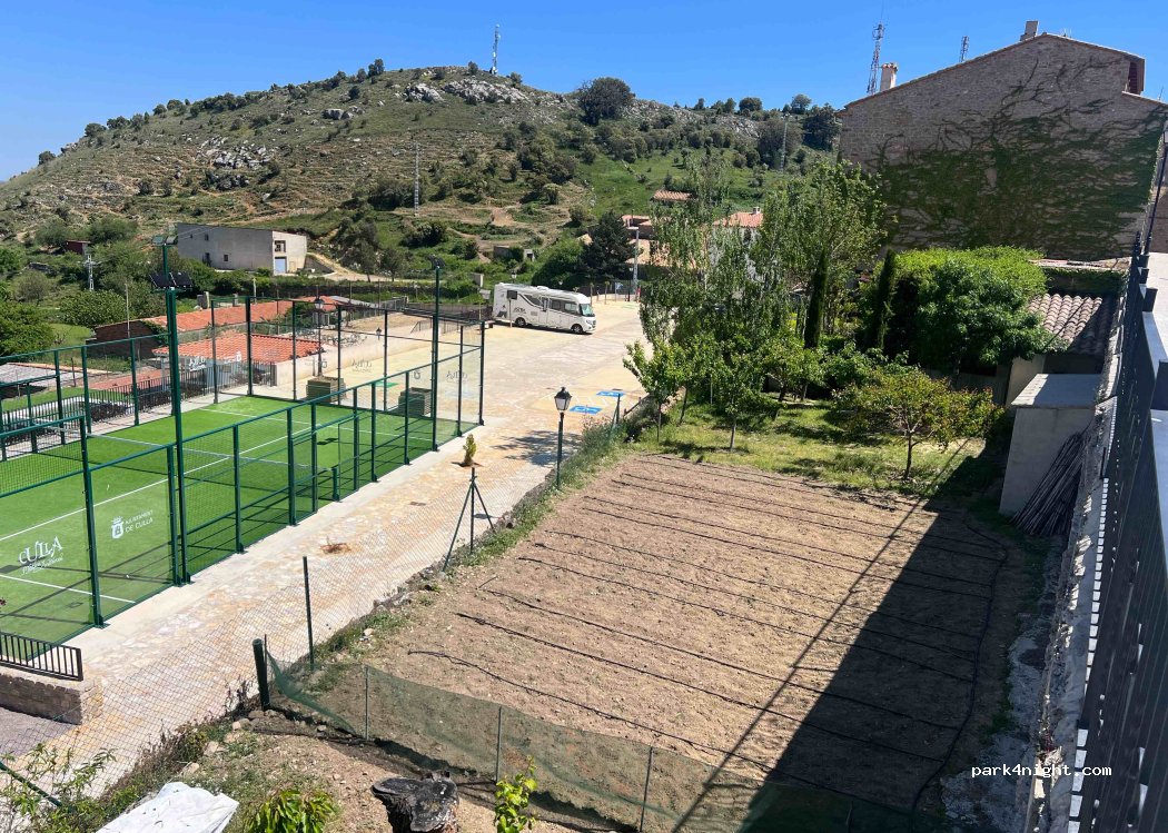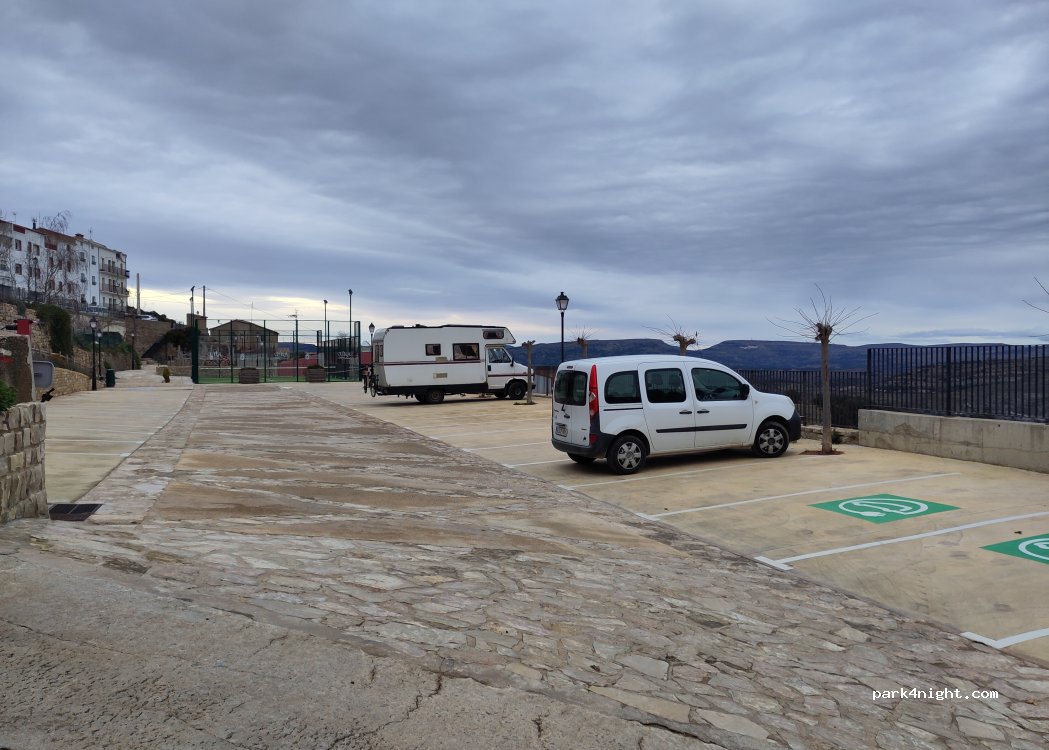 Hemos pasado la noche tranquila y solos, no había ni coches aparcados! Al lado de un parque, piscina municipal y pista de pádel. Perfecto para pasear por el pueblo, que además es muy bonito. Las vistas desde el parking son muy bonitas! No hay ningún tipo de servicio.