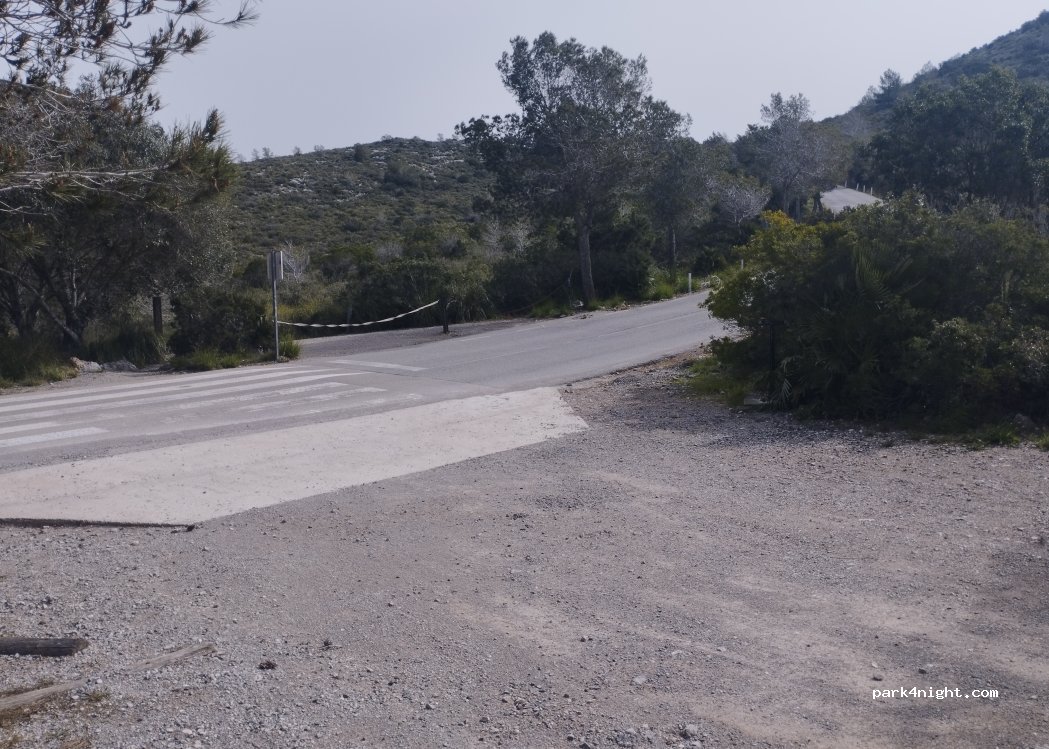 Kleiner Parkplatz im Naturpark von Garraf. Für Vans und kleine WoMo's machbar. Anfahrt zum Teil sehr steil (26% Steigung). Der Platz liegt gleich neben der Strasse man hört die Autos gut. In der Nacht jedoch sehr ruhig. Viele Radfahrer. Bitte lasst keinen Abfall liegen. Auch kein Taschentuch/Toilettenpapier. Davon hat es schon genug.