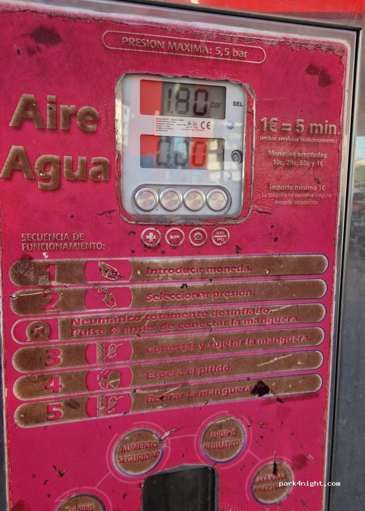 hoy 14/08/25 hemos rellenado con 1€-5min 40litros de agua. no hay para vaciar grises ni negras. la máquina está vieja pero funciona bien.