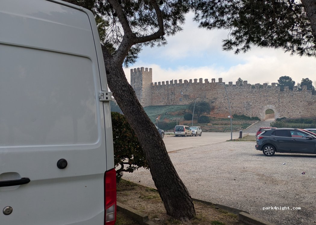 What a gorgeous place to camp for the night. We arrived at 10pm after leaving Barcelona and was easy to get a space (it is December!) and waking up to the beautiful fort was lovely. So peaceful and then the church bells started at 8am but not enough to wake us up properly in the van. No facilities but there are bins. Thank you for making this spot available!