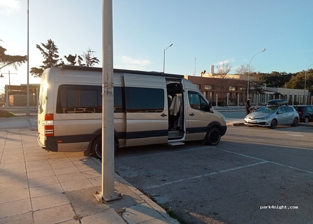 Dormimos un poco más hacia atrás, justo a la entrada del centro deportivo. Tranquilo, solo escuchamos un camión de la basura a media noche. Sin servicios pero muy cerca de los restaurantes del paseo marítimo.
