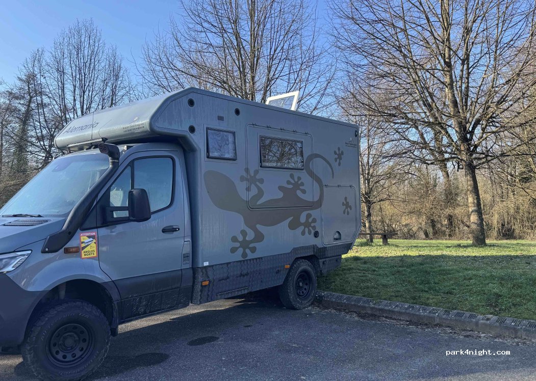 Emplacement calme au bord du fleuve. Les toilettes sont juste à côté et sont propres, il y a aussi une fontaine à eau juste devant et des poubelles. Il y a un bar/restaurant à 100m si besoin. Possibilité de dormir sur le parking goudronné ou même sur l'herbe en bord de fleuve.
