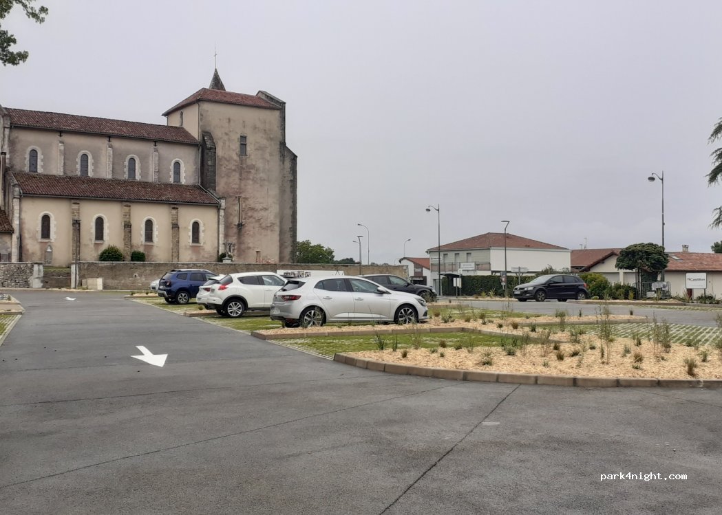 Parking al lado de la iglesia del pueblo y de una carretera bastante ruidosa como de 7:00am a 12:00pm. Baños, fuente, contenedores de basura, mesas de picnic. Panaderías y cafetería muy cerca. Para pasar solo una noche, suficiente.