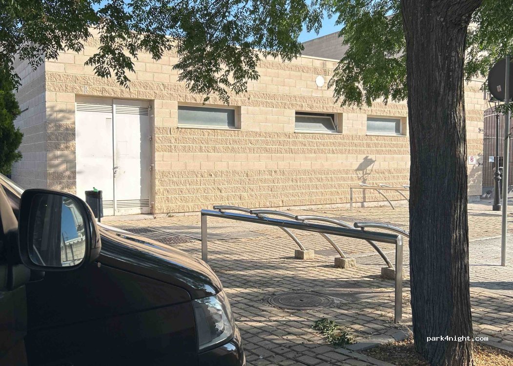 Parking sous les arbres. Situé à côté du centre sportif Jose Ramon de la Morena. Il a de l'ombre. Il a une source. Et c'est un quartier calme.