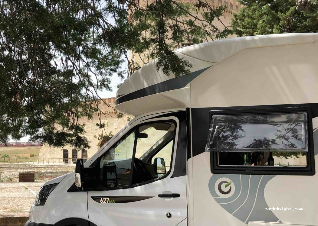 Sitio de fácil acceso, cerca de la Autovía, tranquilo y al lado del castillo con una vista nocturna muy bonita. Nosotros pernoctamos en ruta pero parece buen sitio para conocer el pueblo.