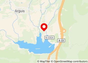 Explanada de tierra con arboles en plena naturaleza junto al pantano de Arguis. El acceso es un camino de tierra un poco bacheado.