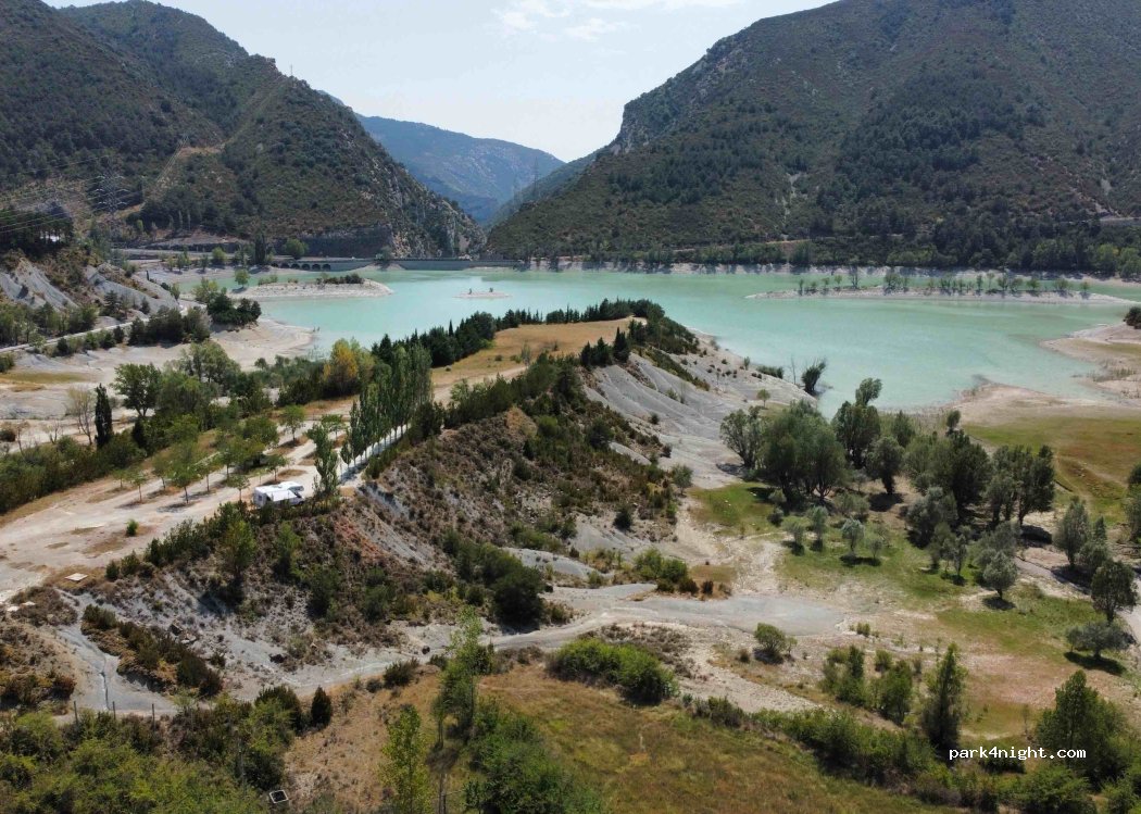 Parking en bon état mais lac à sec en cette période. Très peu d’ombre, rien d’extraordinaires