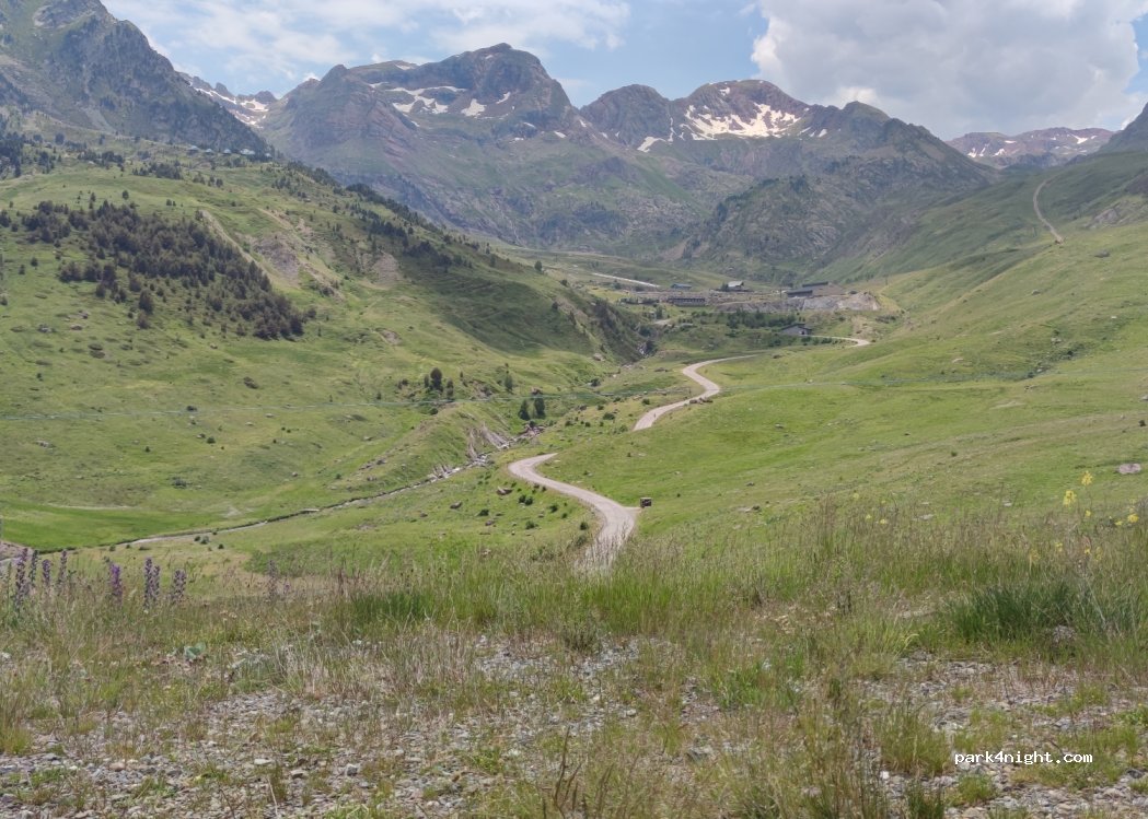 Lloc idíl·lic entre cims. Durant la tarda el color vermell de les Valls és precios. Si es vol anar per la zona de Anayet és perfecte. Vam passar-hi dos nits. Està ple de furgonetes i autocaravanes, hi caben 30/40 aparcades bé. L’únic inconvenient es que està al costat de la carretera però el soroll dels cotxes no molesta. Per últim, el terreny és bastant planer.