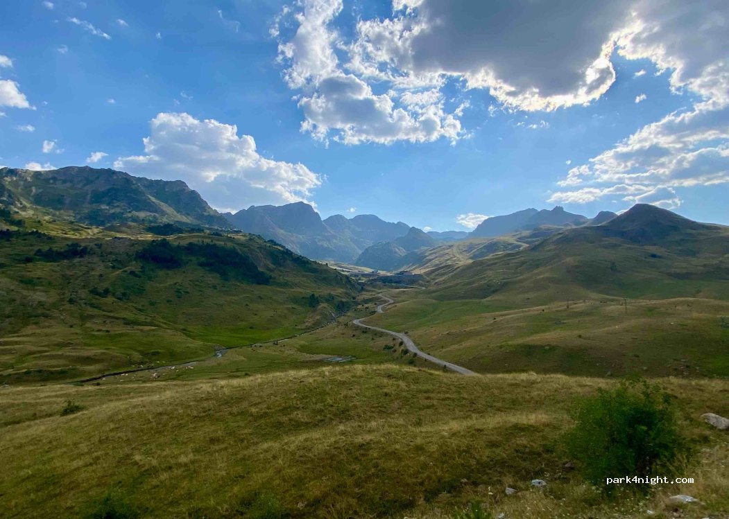Day and night parking for all types of vehicles. There are quite a few places (about 10 campers). There are no services. Although, nearby is Formigal. Wonderful views of the valley, both at sunrise and sunset. Incredible peace, sleeping near the starry ceiling. A traveling greeting.