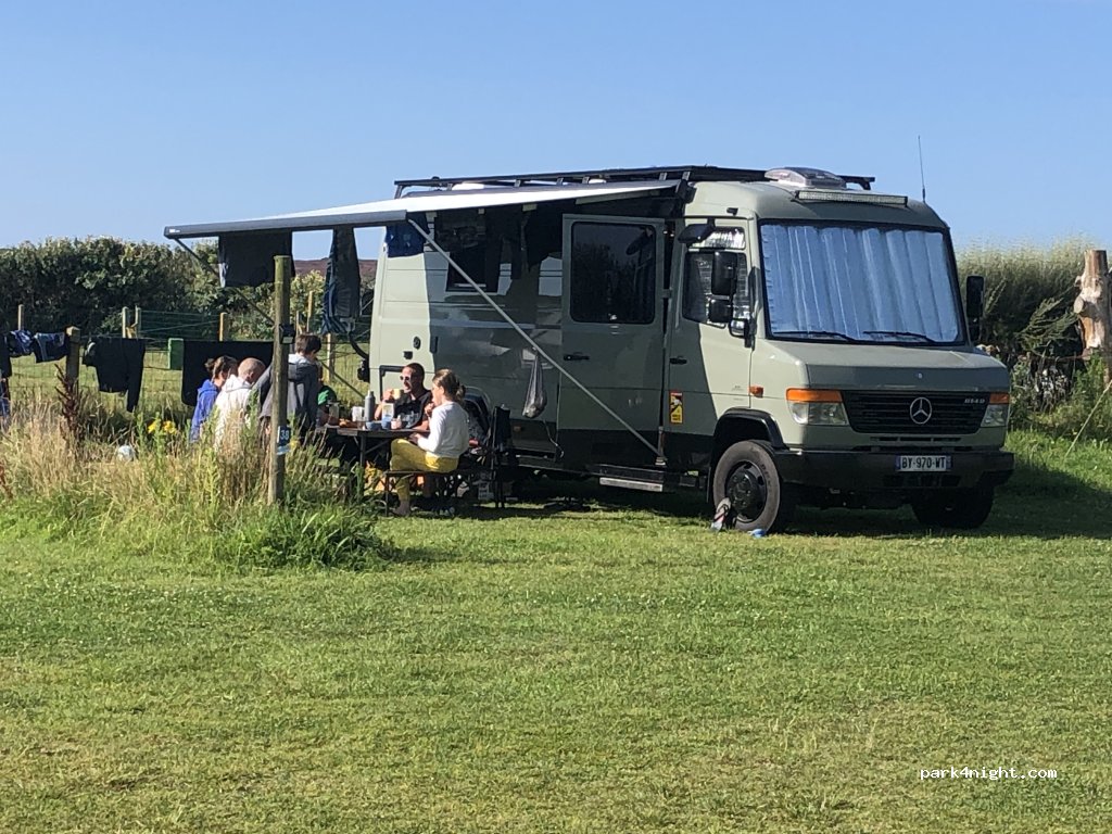 La gérante est adorable et nous a permis de stationner plusieurs jours sur le parking visiteur qui est un grand champ d’herbe à 2 pas de la plage. Tout était complet le week-end du 15 août et ça nous a bien dépanné.