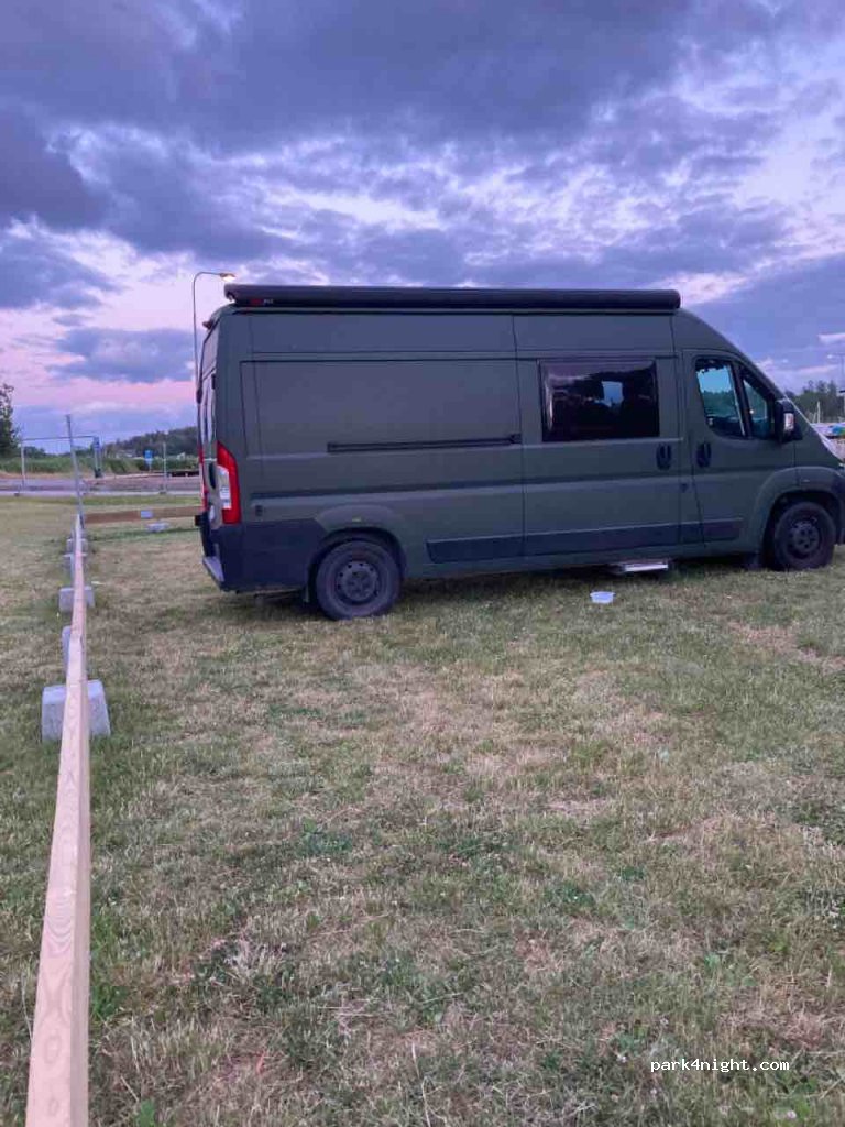 Barrière hauteur pour voitures, les camping car ne passent pas. Place spécial camping car juste avant payant avec carte de crédit 140 couronnes 24h avec acces eau, vidange eau grise au top