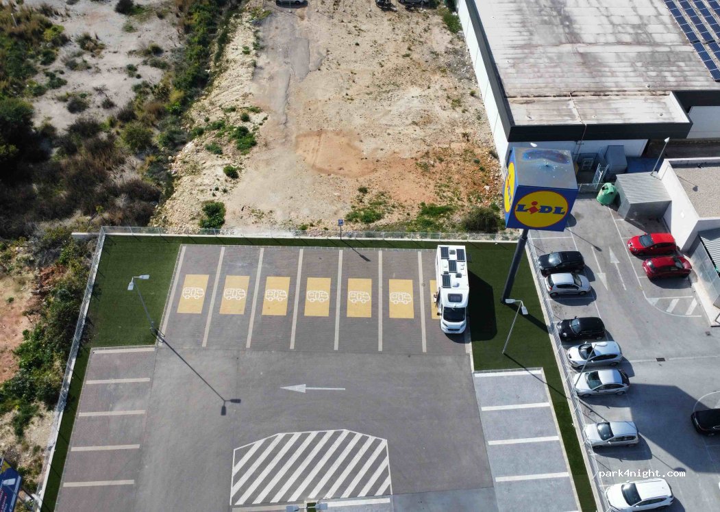 Buen lugar para poder descansar hoy domingo la barrera está abierta y el Lidl cerrado. No tiene servicios.