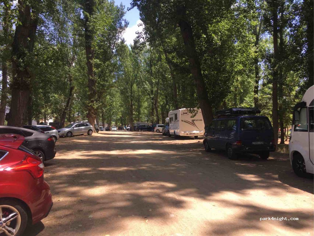 buen sitio para pernoctar, estuvimos en marzo y bien ,no che tranquila sin problema,junto al río y cerca para visitar el pueblo, solo dispone de contenedores de basura . zona de tierra, al otro lado del puente hay un aparcamiento público asfaltado , está bien para cuando llueve.