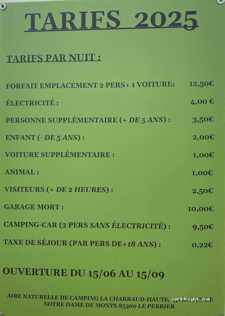 Très bon accueil . Propriétaire très sympathique . Dans un cadre agréable et verdoyant . Vaste emplacement . Sanitaires . Électricité si besoin . A 8 kms de la belle plage des Demoiselles à St Jean de Monts . Nous y reviendrons .