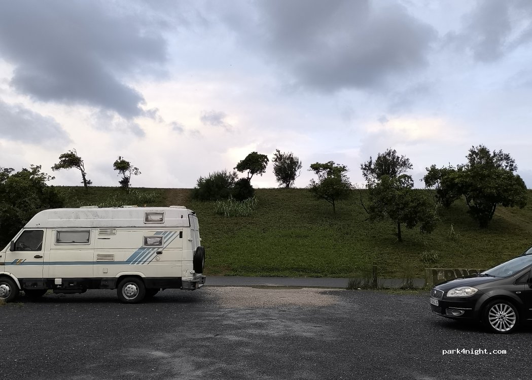Upper parking is closed but the bottom parking is open. The bar is removed but it says max 2,3m and 5m lenght. My van is a bit higher and probably longer but the police didn't say anything. Toilet closet. Fresh water fountain available. Ok for one night / to go surfing. Many other vans stayed for the night.