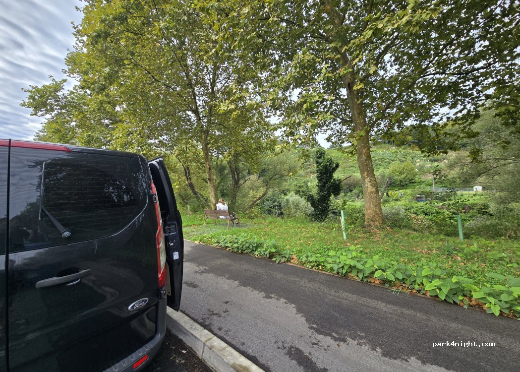 We spent a quiet night here. It's in an industrial area where people park their trucks and vans, BUT it's right next to the river, so it felt very natural. Super quiet, with only sounds of the birds and the occasional train (but not at night).
