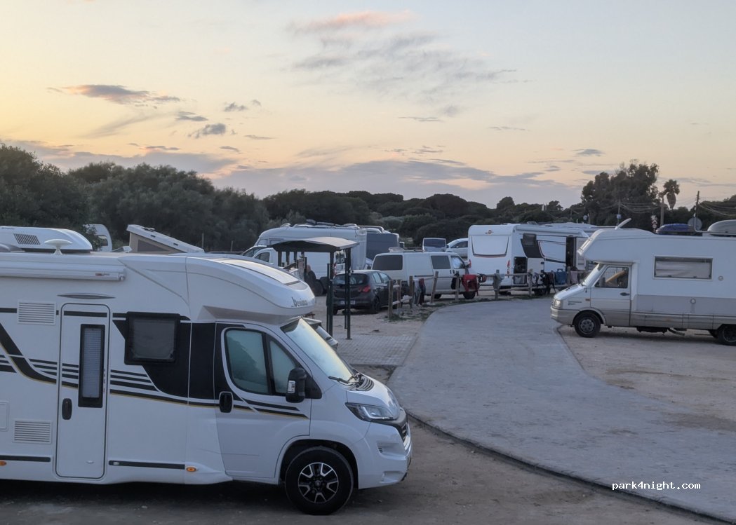 Aviso importante: esquiva el banco de arena del centro o te quedarás encallado. Es un aparcamiento de gorrillas, donde pagas la voluntad. Parecen de fiar, viven de ese aparcamiento y tienes la caravana vigilada. Delante justo de la pasarela de acceso a la playa, no hay servicios pero enfrente hay una tienda bien equipada y multitud de chiringuitos. Muy recomendable para aparcar en la zona.