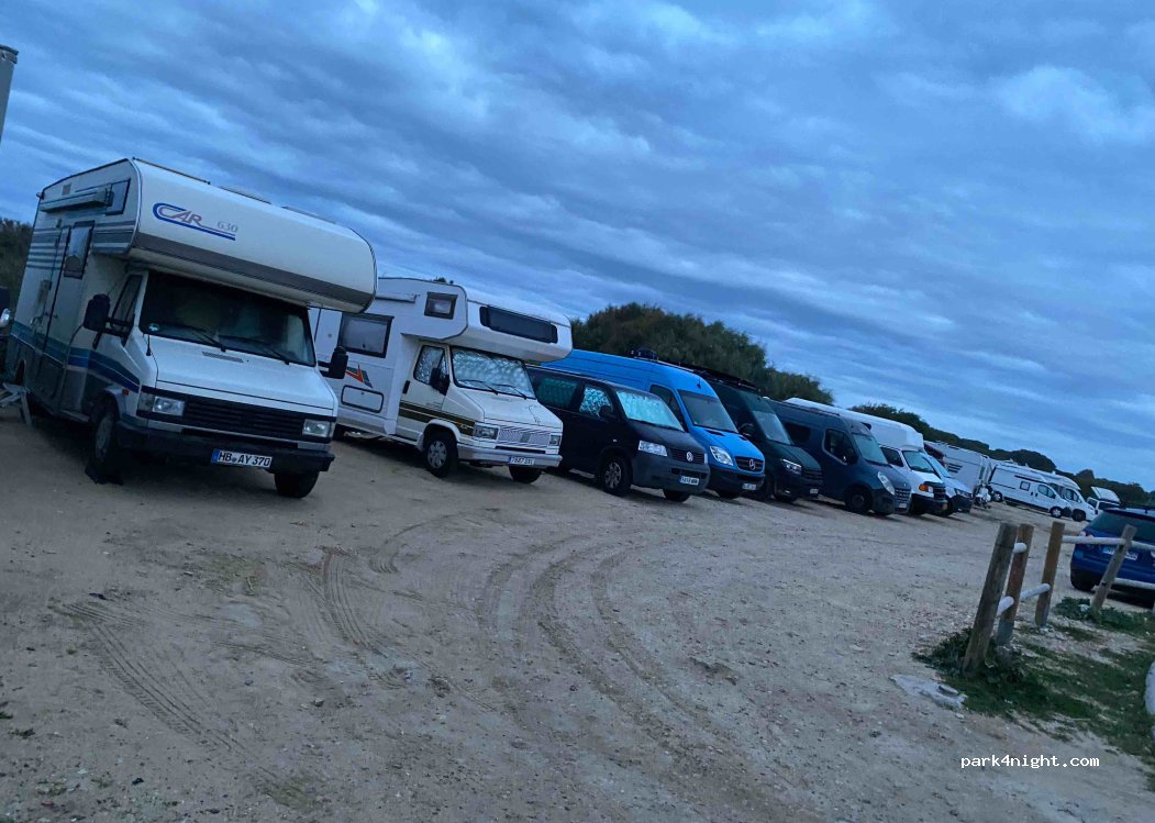kleiner parkplatz direkt am meer, hinter den dünen, aber auch an der straße. war hier mit einigen campern. in der nebensaison ruhig. schöner strand zum surfen. mülltonnen vorhanden.
