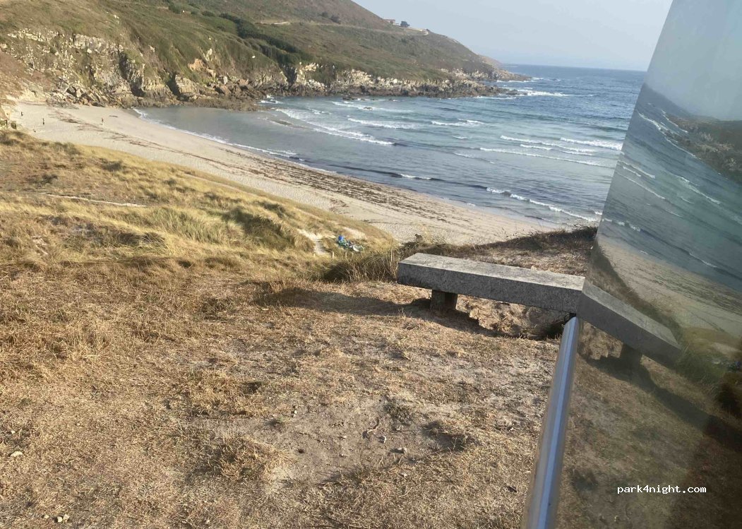 Petit parking à côté de la plage. Tables et barbecues. Douches Accès par des rues un peu étroites. Ne convient pas pour dormir, très incliné.