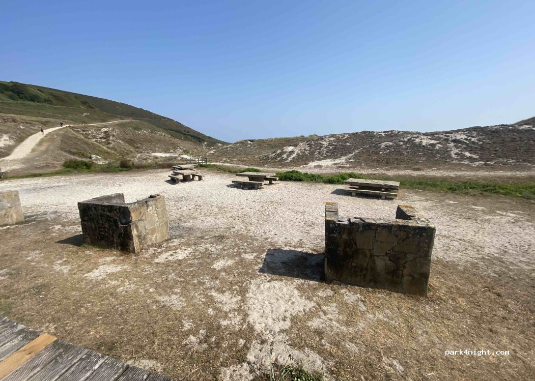 Spot parfait, juste au-dessus de la plage, avec douche, fontaine, tables et barbecues. Possibilité de dormir avec un petit van.