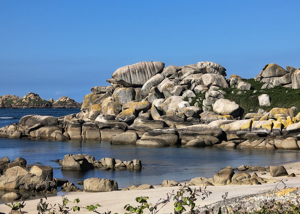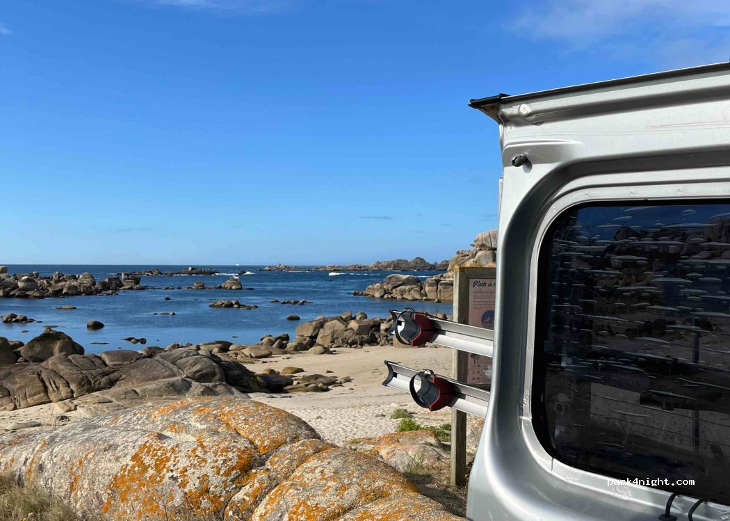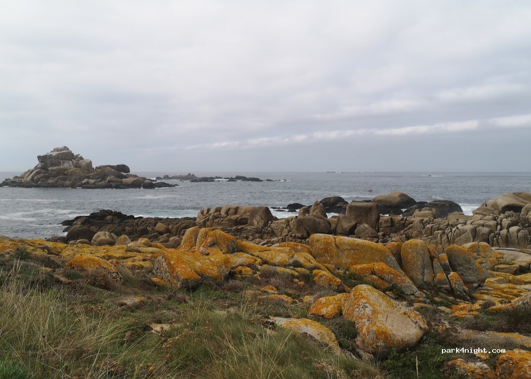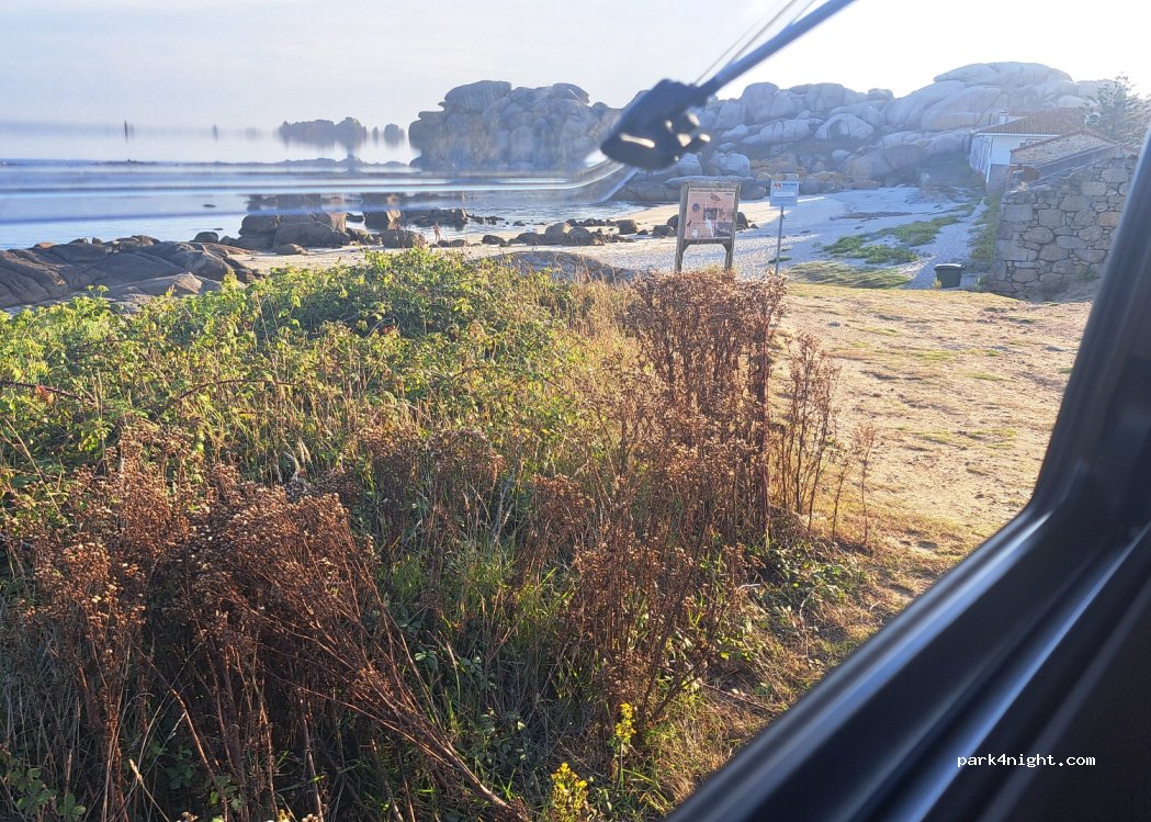 Aparcamos a pie de playa,una zona ideal para descansar, para nuestra grata sorpresa la playa es de perros . Hay un montón de rutas para hacer,el pueblo Aguiño queda caminando a 30m allí hay un super, panaderías y bares ,la ruta caminando se hace muy amena y hay playitas muy poco frecuentadas de camino. Cerca hay un merendero con fuente de agua y churrasqueras,no hay zona de vaciado ni de llenado
